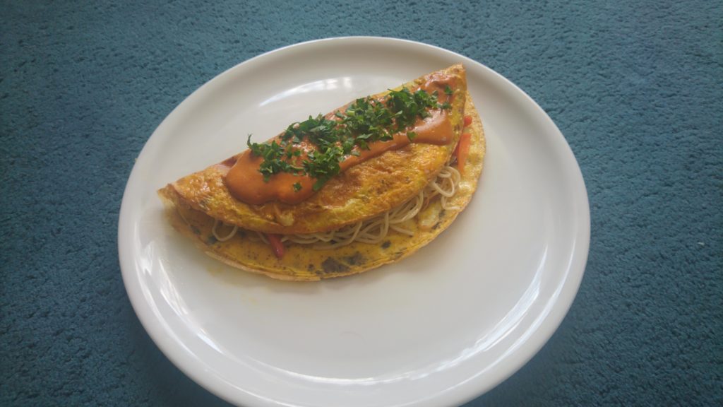 Makaron stir – fry z warzywami zamknięty w omlecie, a wszystko polane pikantnym sosem. W końcu omlet nie jedno ma imię, tutaj jego wersja na sposób japoński.