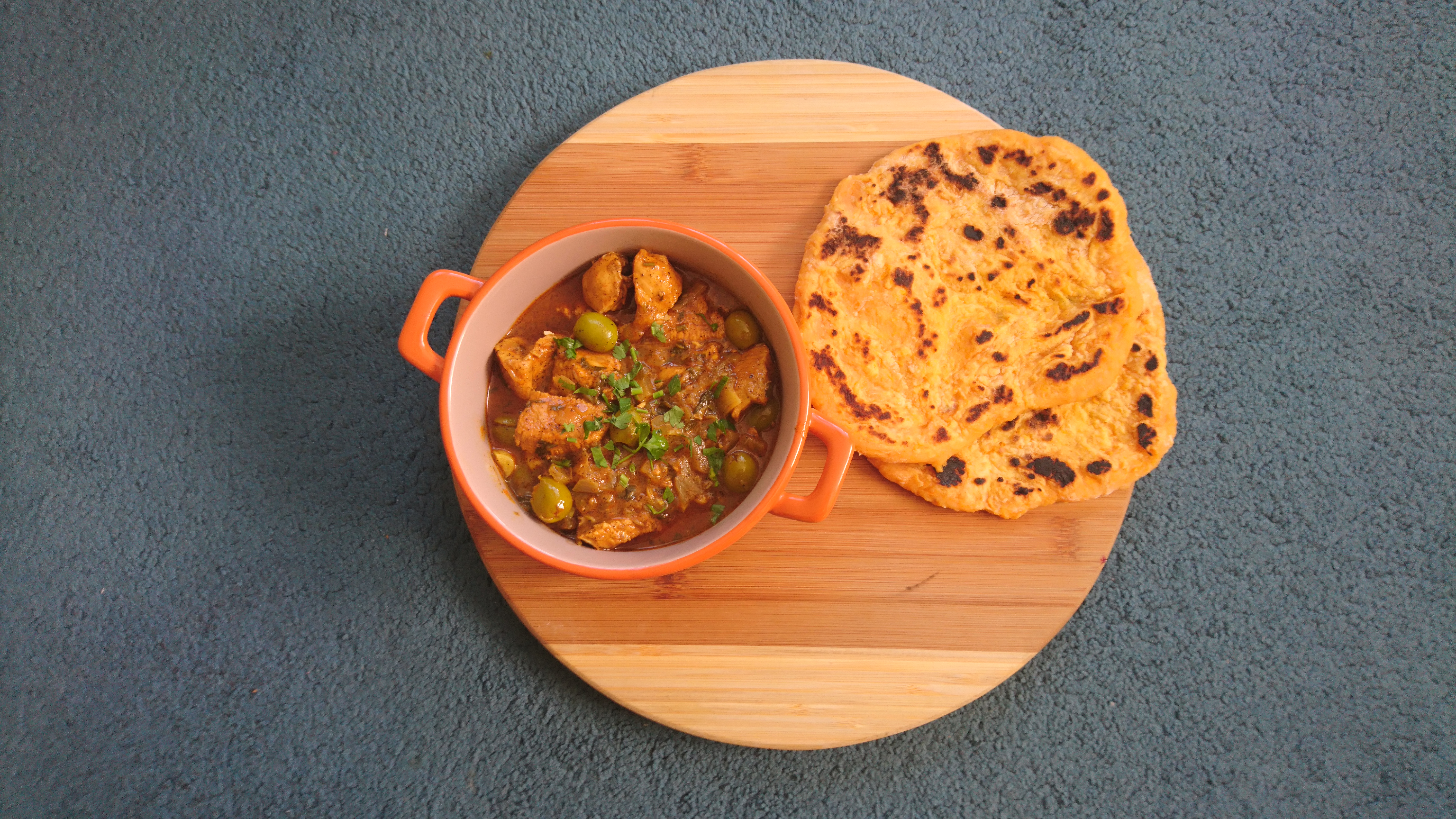 Druga propozycja to Tadżin z kurczaka w sosie cytrynowym, tu właśnie użyłem kiszonych cytryn. Danie przenosi nasze kubki smakowe wprost do Maghrebu. Tadżin podałem dodatkowo z plackami roti z batatów.