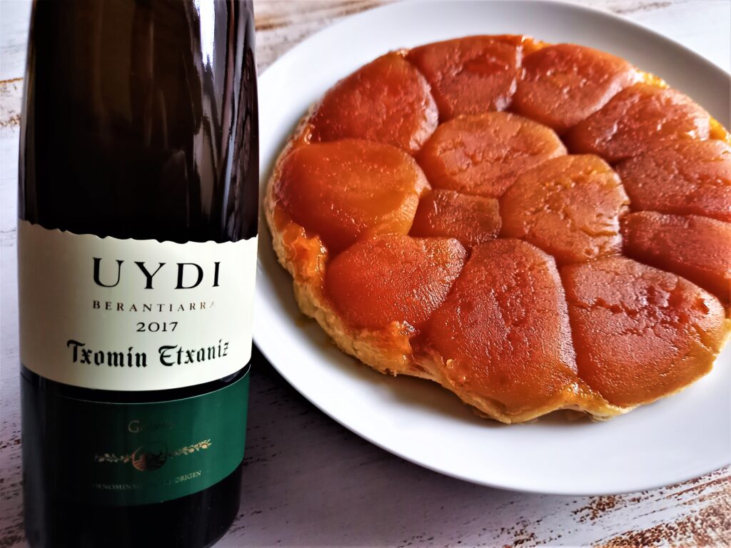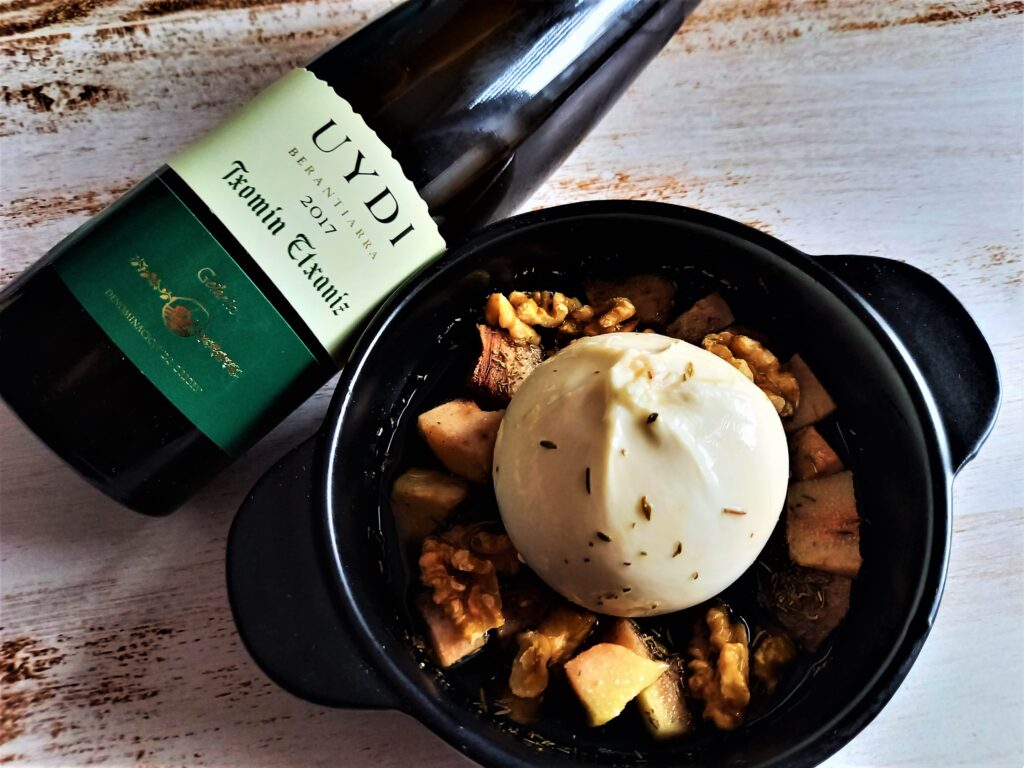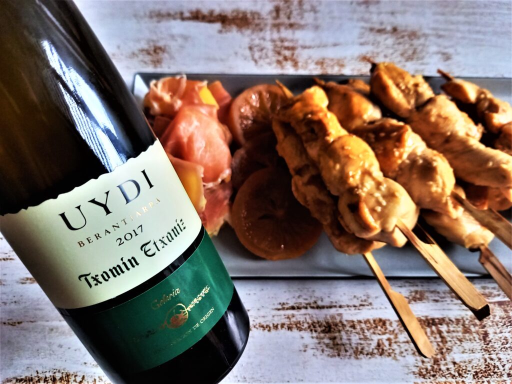 Txomin Etxaniz Uydi podałem do kilku małych danek, a mianowicie do kanapki z marynowaną gruszką, gorgonzolą i orzechami, pieczonej burraty z miodem i owocami, yakitori ze słodką, marynowaną cytryną oraz tarty tatin. Najlepiej wypadło z burratą, całkiem nieźle też z kanapką i yakitori, natomiast w stosunku do klasycznej tarty tatin, to txakoli nie ma tyle materii i słodyczy, aby idealnie się z nią połączyć, choć ogólnie nie było źle. Ponadto, sprawdzi się z lekkimi owocowymi deserami, sernikiem, świeżymi serami, prosciutto z melonem, ale też z owocami morza na słodko z dodatkiem np. ananasa czy innych owoców egzotycznych.