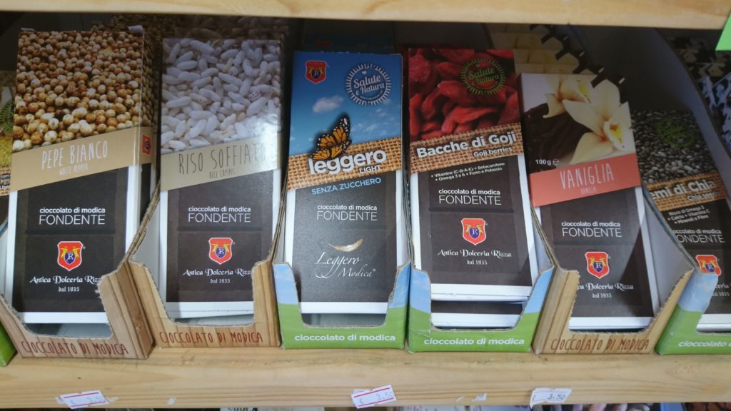 Zacznę od wspomnianej już w tytule postu Modici. Ci bardziej zorientowani z pewnością wiedzą, o co chodzi. Mowa tu o prawdziwym skarbie Sycylii – czekoladzie Modica wytwarzanej na wyspie w miasteczku Modica. To zupełnie inna liga w porównaniu z czekoladami, które znamy ze zwykłych sklepowych półek. Modica w zestawieniu z nimi to prawdziwy rarytas, dzieło sztuki. Ta czekolada jest wytwarzana według starej, tradycyjnej receptury, praktycznie dziś już nie spotykanej, tak jak robili to Aztekowie. W jaki sposób aztecka receptura trafiła na Sycylię? Jak wiadomo, Sycylia przez kilka stuleci była pod panowaniem Hiszpanii i to właśnie hiszpańscy konkwistadorzy przywieźli ze sobą kakao i ten tradycyjny sposób produkcji czekolady. Ta metoda wytwarzania czekolady jest wciąż żywa w miastecku Modica. Ziarna kakao są rozcierane na zimno ( technologia na zimno ) przy użyciu kamiennych żaren. Kakao nie jest konszowane, pasta kakaowa jest poddawana obróbce w temperaturze jedynie 40 stopni Celsjusza. Do czekolady dodawany jest cukier, który dzięki zastosowaniu technologii na zimno nie rozpuszcza się i daje czekoladzie charakterystyczny wygląd ziarnistej tekstury. Modica nie zawiera żadnych ulepszaczy w postaci emulgatorów, lecytyny, mleka w proszku. Tylko naturalne składniki ( dwa lub trzy ) wystarczą, by stworzyć czekoladowe arcydzieło. Chrupiąca, ziarnista tekstura z wyczuwalnymi ziarenkami cukru przenoszą nasze podniebienia na zupełnie inny poziom. Czekolada występuje w wersji czystej, bez żadnych dodatków, a także w różnych wariantach smakowych, tylko z wykorzystaniem naturalnych składników. Możemy wybierać m. in. w czekoladzie z solą morską, cynamonem, wanilią, konopią, ziołami, migdałami, kawą, chili, karobem, marsalą, suszonymi owocami itd. Większość dodatków smakowych w postaci orzechów, owoców pochodzi z samej Sycylii. Jeżeli jesteście wielbicielami prawdziwej czekolady bez zbędnych ulepszaczy i nie mieliście jeszcze okazji skosztować tych z Modica, to koniecznie musicie nadrobić zaległości. Wspaniały czysty, wyrazisty smak, cudowna tekstura sprawiają, że każdy kawałek tej czekolady to przyjemność w najlepszym wydaniu. Wyobraźcie sobie możliwość delektowania się tą czekoladą z filiżanką kawy, kieliszkiem Marsali, Porto, Banyuls, Grappy……….. Albo po prostu tylko my i czekolada. Naprawdę warto. Cena czekolady wynosi ok. 2-3 euro za tabliczkę 100g.