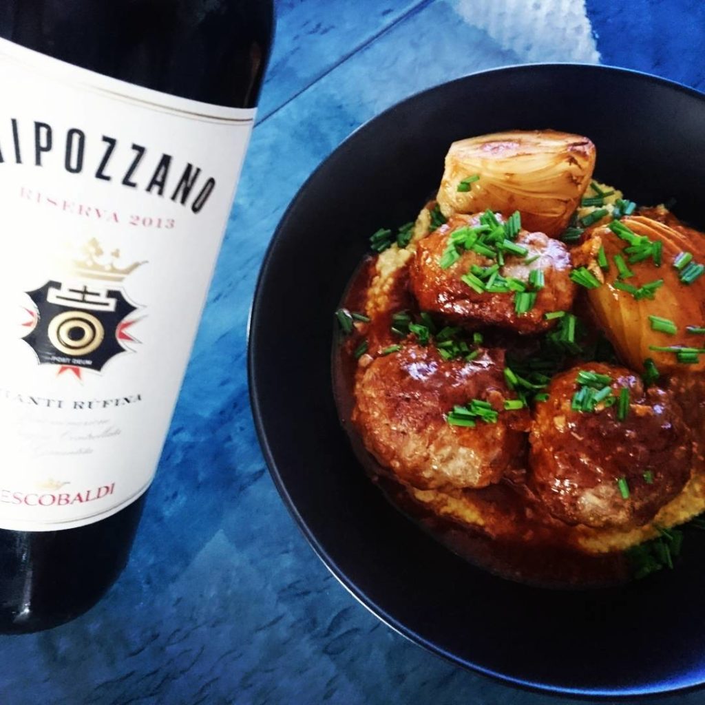 Do tych klopsików wypiłem butelkę Nipozzano Chianti Rufina Riserva od Frescobaldi ( tutaj ). Wino poradziło sobie całkiem nieźle, choć sos jest bogaty smakowo i on odgrywa w całym daniu ważną rolę. Można spróbować połączyć tą potrawę z innym, pełniejszym, dojrzałym Sangiovese, winami z Doliny Rodanu, Langhe Nebbiolo, Carmenere, Zinfandel. A może warto otworzyć nawet Rioję Reservę. W każdym razie poszukajmy wina nieco pełniejszego, dość wyrazistego w swoim smaku.