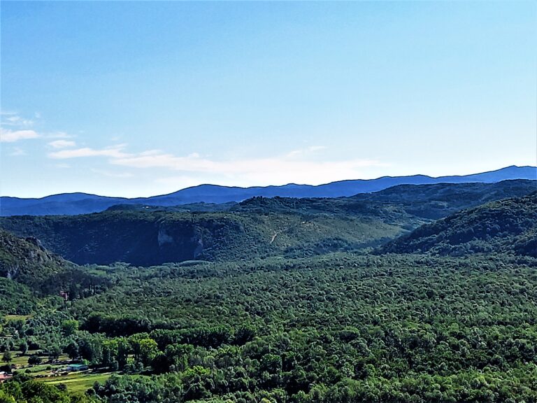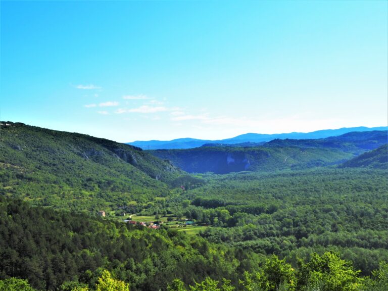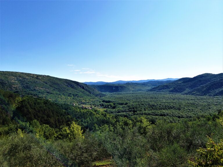 Wdrapać oczywiście samochodem, bo w przeciwnym razie może być ciężko albo przynajmniej wszystko zajęłoby dużo więcej czasu. Mimo, że to tylko dosłownie kilka kilometrów od głównej trasy, to trzeba wspiąć się nieźle pod górę przez istryjski las i gaje oliwne. Gdy już dotrzemy do celu, mamy wrażenie, że jesteśmy na końcu świata. Niczym niezmącona cisza i spokój, wokoło nie ma żywej duszy, w zasięgu wzroku gęste korony drzew wyglądające jak zielony dywan rozłożony na istryjskich wzgórzach poprzecinany miejscami drzewami oliwnymi i winnicami. Szczęście, że są nadal takie miejsca, których piękna człowiek jeszcze nie zniszczył.