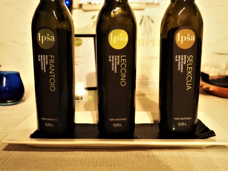 Kto zdecyduje się na tą małą wyprawę w to miejsce, będzie mógł nie tylko podziwiać bukoliczne widoki, ale też spróbować i zakupić pysznych i wielokrotnie nagradzanych win oraz oliw od rodziny Ipša. O mojej wizycie w tej niewielkiej posiadłości pisałem tutaj przy okazji recenzji ich świetnej malvaziji. Dla szybkiego przypomnienia, Ipša to niewielki rodzinny producent, a ich wina i oliwy biją na głowę sporą część bardziej znanej konkurencji. Właściciele postanowili powrócić do tradycji swoich przodków i w 1998 roku na nowo zaczęli pracę w starych gajach oliwnych, jak i w winnicach. Istria słynie przecież z wybitnej oliwy i niejednokrotnie została uznana za najlepszy region do jej produkcji. Wina tutaj również świetnie się udają, a Ipša może być wzorem zarówno w kwestii jednego, jak i drugiego. Potwierdzają to choćby liczne nagrody, którymi rodzina może się pochwalić. Dla mnie ich oliwy to bez wątpienia jedne z najlepszych w całej Istrii. Ipša tłoczy genialne aromatyczne oliwy z takich odmian jak frantoio, leccino, bjelica, crnica, bugla. Są naprawdę doskonałe.