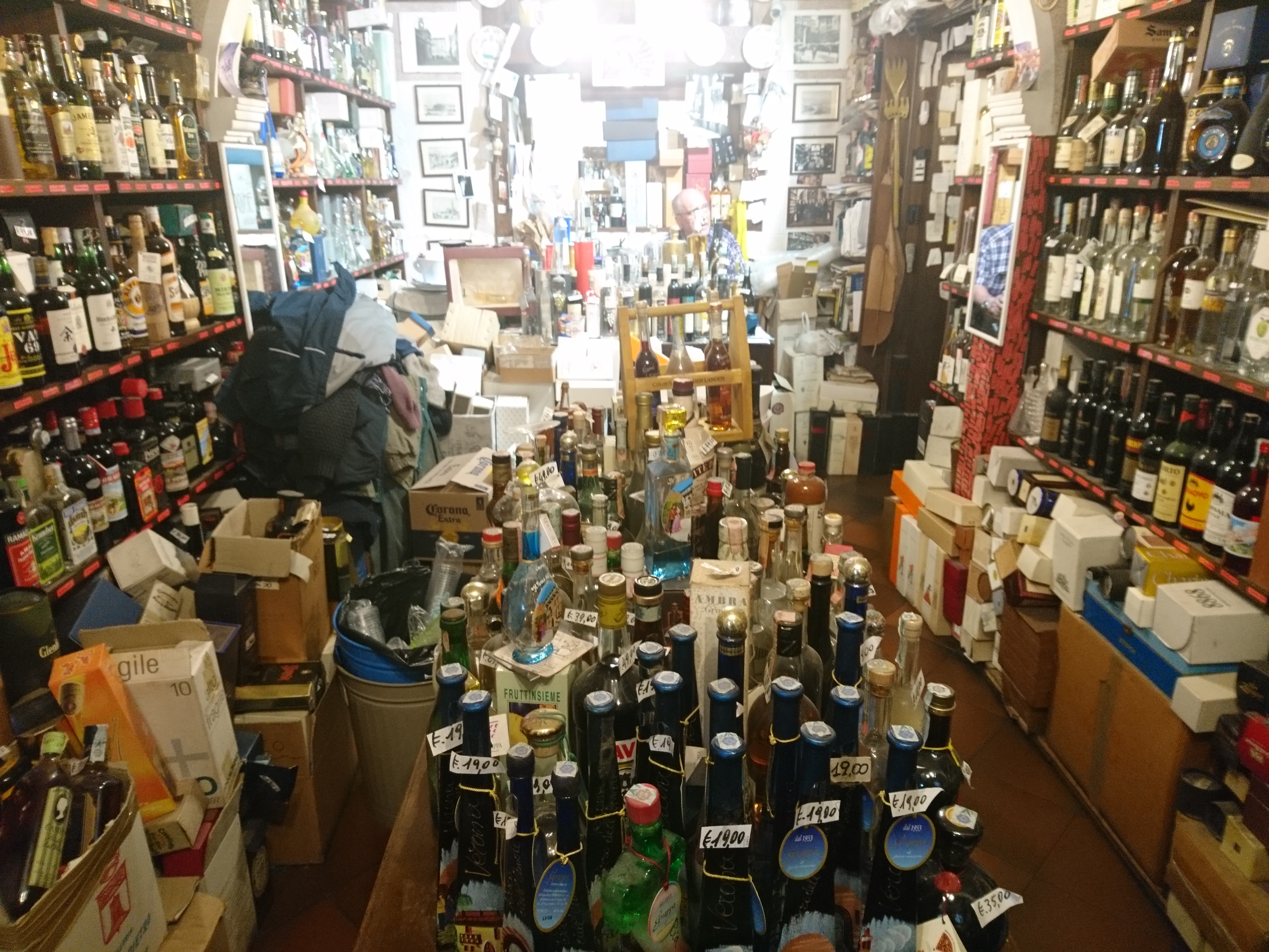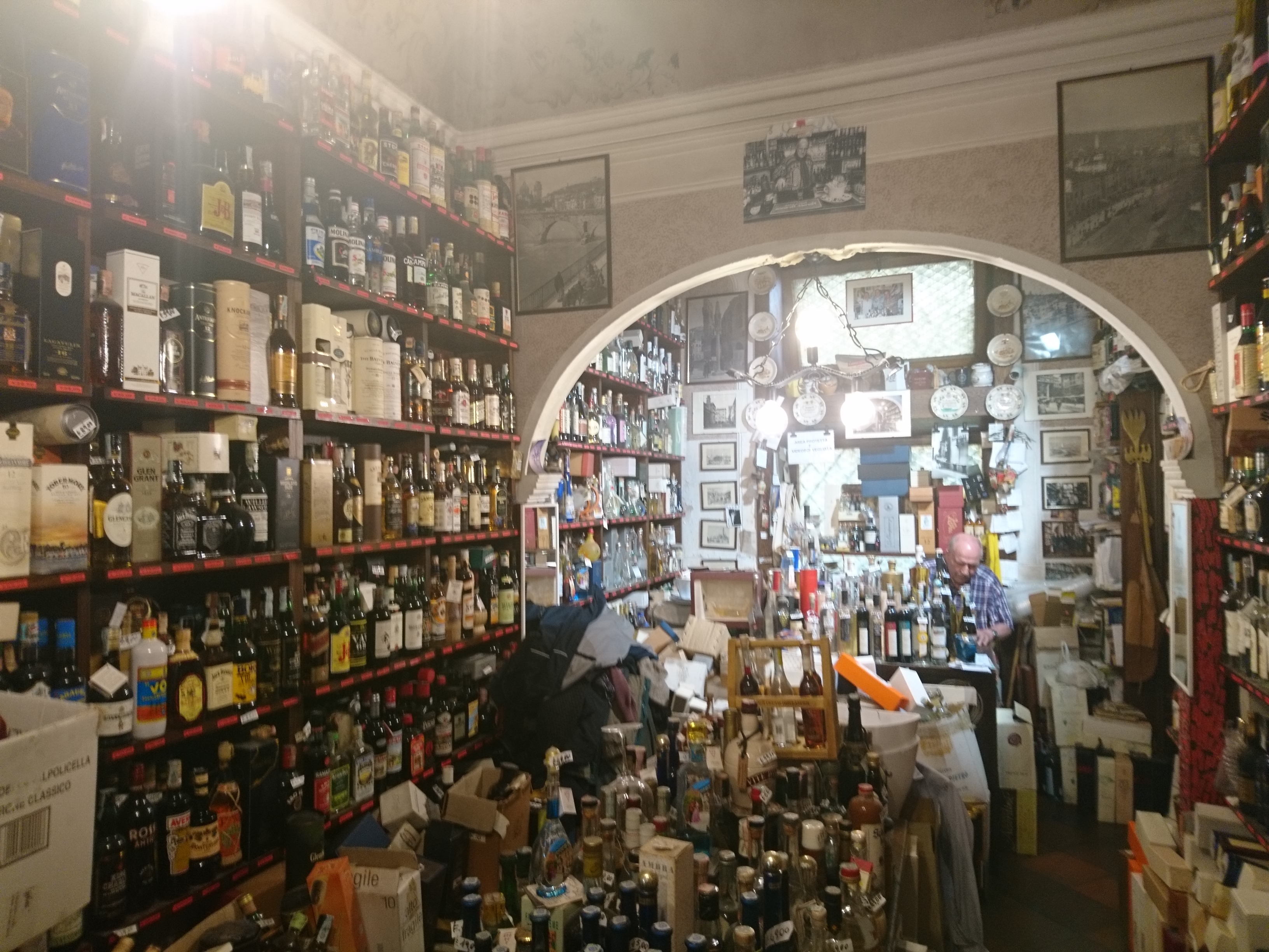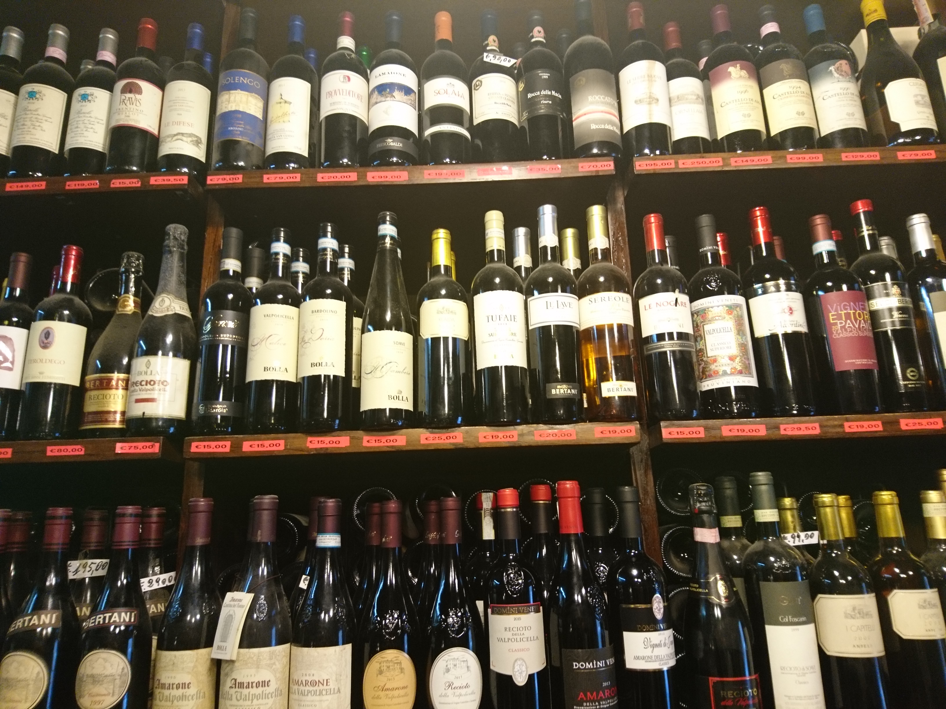 Trochę trudniej tu trafić, ale jeśli ktoś bardzo chce to bez problemu znajdzie drogę. Enoteca została założona w 1958 roku i jest trochę przeciwieństwem Signorvino. Tam mamy nowoczesność, podążanie za nowszymi trendami, natomiast Enoteca Dal Zovo Oreste to miejsce z tradycją, które chyba niewiele zmieniło się od chwili swojego powstania. I bardzo dobrze. Właściciel również ten sam już sile wieku, ale znający się na rzeczy, gdyż jest akredytowanym sommelierem. Ciepło wita gości, choć komunikacja z Panem Oreste jest trochę utrudniona, ponieważ włada jedynie językiem włoskim ( a przynajmniej tak mi się wydaje, bo po angielsku dogadać się nie udało ). Ale w końcu wino zbliża do siebie ludzi i bariera językowa znika. Właściciel od razu zaproponował degustację dwóch Amarone, z czego oczywiście skorzystałem. Selekcja win w Enotece Oreste jest naprawdę imponująca. Wysokie aż po sam sufit regały pełne są włoskich etykiet, także tych kultowych i bardzo drogich. Do tego wybór win z innych krajów oraz istne królestwo grappy i różnych mocnych alkoholi jak koniak, armaniak, brandy, likiery itp. Znaleźć też tu można bardzo dobre octy balsamiczne i oliwy. Prawdziwe miejsce z duszą. Zakupy również zrobione.