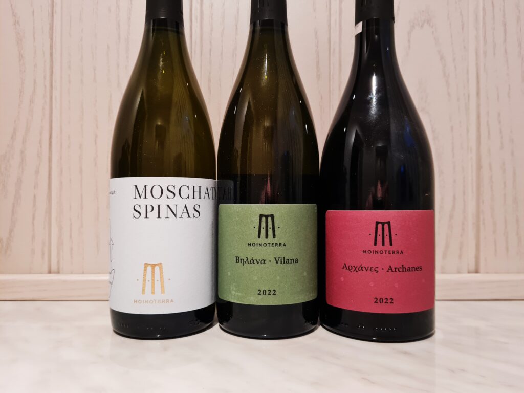 Z portfolio wytwórcy mam przed sobą trzy etykiety: Moinoterra Moschato Spinas 2022, Moinoterra Vilana 2022, Moinoterra Archanes 2022.