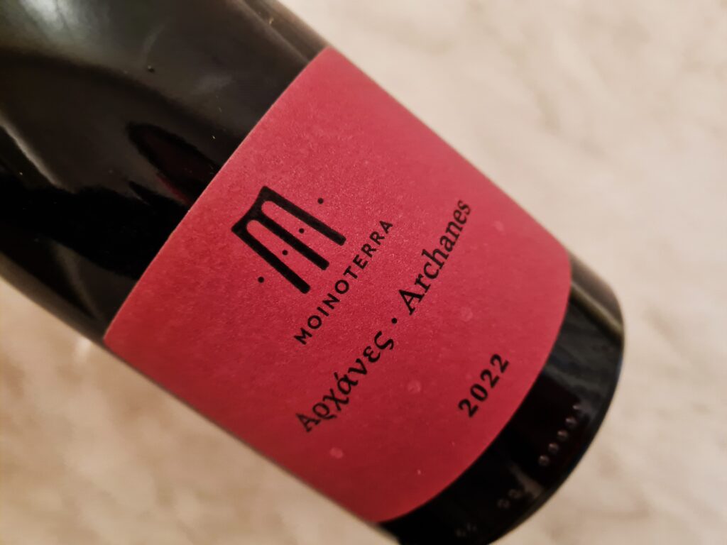 Moinoterra Archanes 2022 to kompozycja 70% kotsifali i 30% mandilaria. Grona pochodzą z pojedynczej winnicy położonej na wysokości 650 m n.p.m. gdzie winorośl uprawia się od 4000 lat. Winnica liczy sobie 25 lat i utrzymuje się tu niską wydajność. Oddzielna winifikacja dwóch odmian, brak kontaktu z beczką, 8 miesięcy dojrzewania w stalowej kadzi na osadzie. W kieliszku wiśnia, kwaskowy czerwony owoc, jagody, kwiaty, odrobina ziemi, soczystość, świeżość, ale też struktura i styl przypominający nieco czerwone burgundy. Kolejna bardzo dobra pozycja od Moinoterra.
