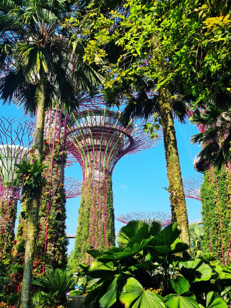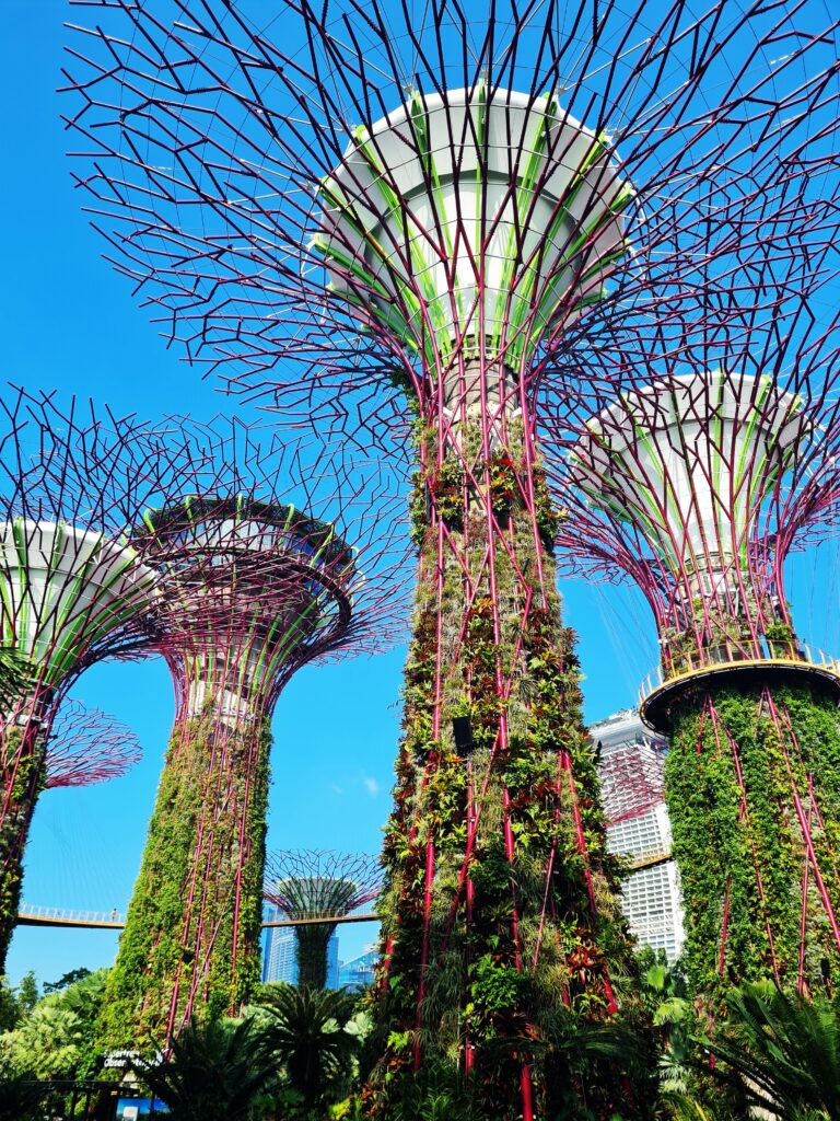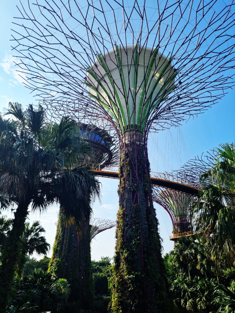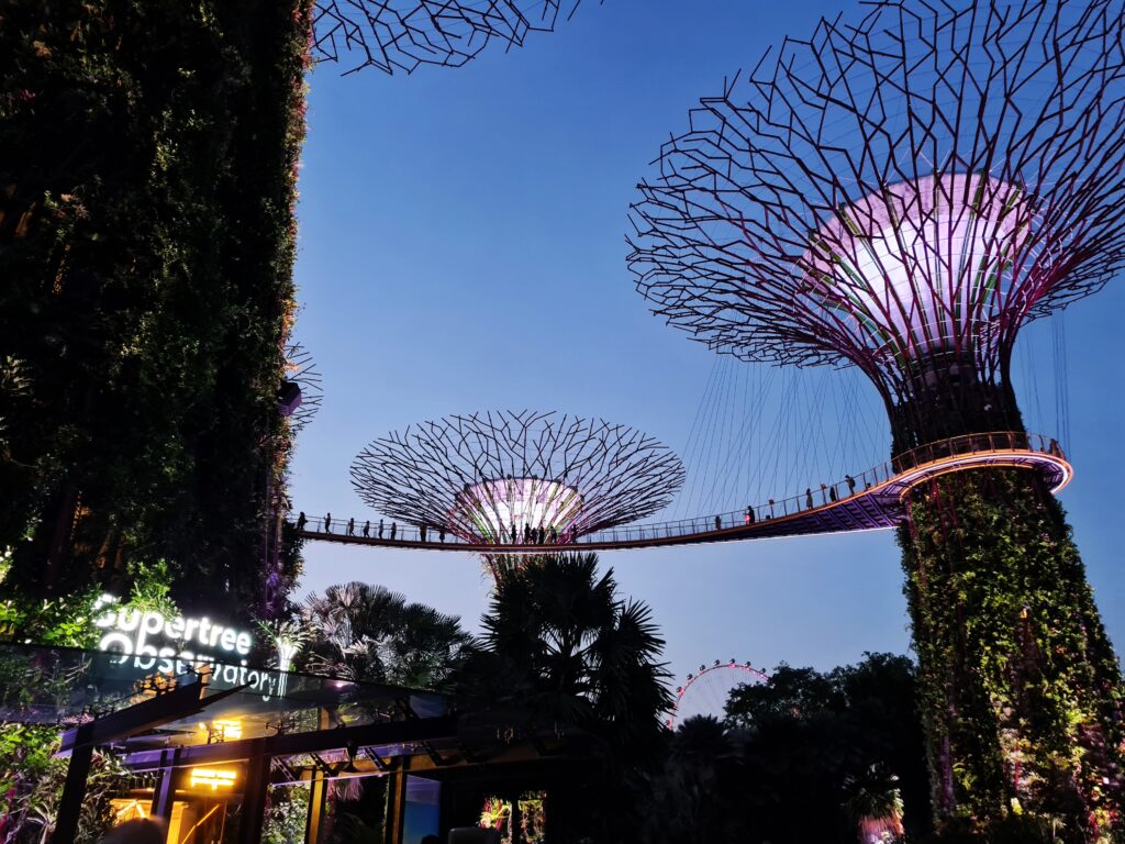 Supertrees to bez wątpienia konstrukcje, które są największą atrakcją ogrodów. Jest ich w sumie 18, a 12 z nich znajduje się bezpośrednio obok siebie w tzw. Supertree Grove. Mają one różną wysokość, od 25 do nawet 50 metrów ( najwyższe z nich ) i stanowią coś w rodzaju wysokich, pionowych ogrodów. Ich konstrukcje są porośnięte rożnymi roślinami ( w sumie ponad 200 gatunków ), co wygląda naprawdę zjawiskowo. Dodatkowo pozyskują też energię słoneczną. Naprawdę warto zrobić sobie wśród nich spacer za dnia, podobnie jak zresztą po pozostałej części ogrodów, gdyż to czysta przyjemność. Można tu odetchnąć od zgiełku centrum miasta, odpocząć no i oczywiście podziwiać egzotyczną roślinność. Prawdziwa gratka dla miłośników tematu. Wstęp do ogrodów jest darmowy, a chętni mogą zakupić bilety na specjalną kładkę (OCBC Skyway) i podziwiać wszystko z góry ( szczerze polecam tą atrakcję ). Można też kupić wejście na najwyższe drzewo (Supertree Observatory) i cieszyć się wspaniałą panoramą nie tylko ogrodów, ale i całej Marina Bay.