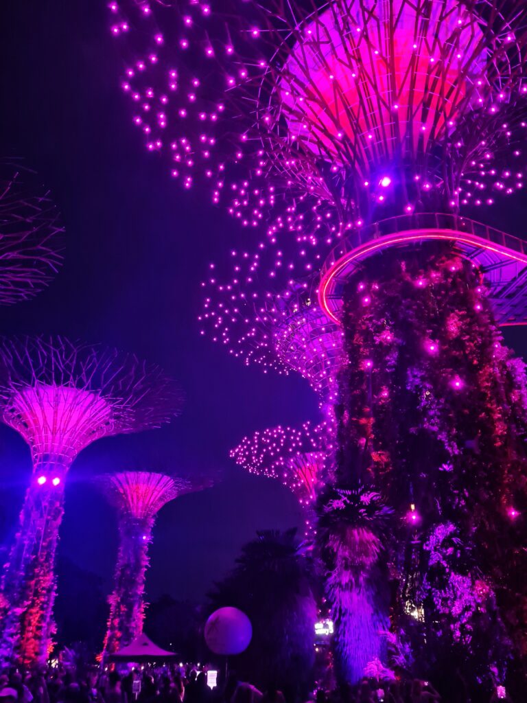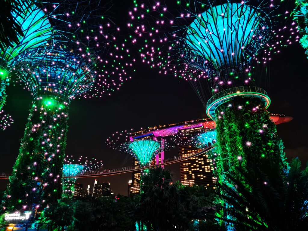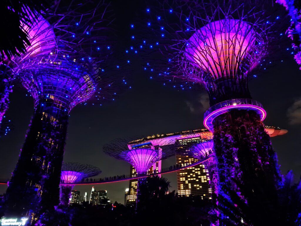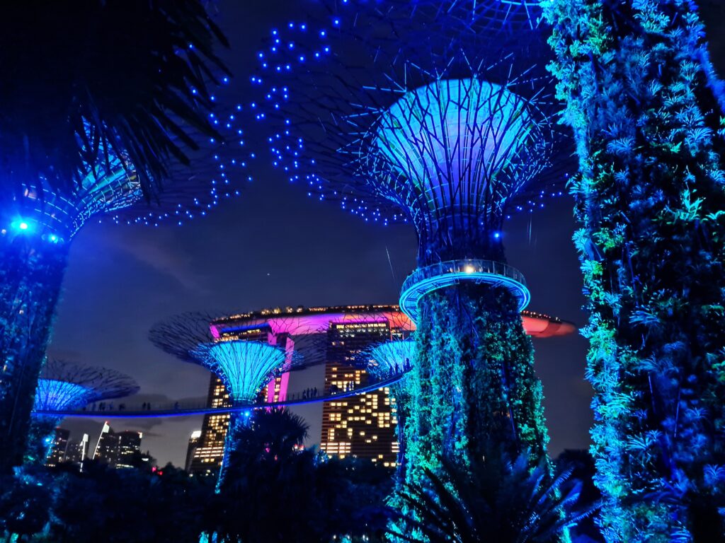 Wspomniałem, że warto wybrać się do Gardens By The Bay przynajmniej dwukrotnie – pierwszy raz rano lub za dnia, aby pospacerować po samych ogrodach, drugi raz wieczorem, gdyż to właśnie wtedy rozpoczyna się spektakl zwany Garden Rhapsody – cudowne doświadczenie, które powinno byc udziałem każdego w Singapurze. Gardens Rhapsody ma miejsce codziennie o 19:45 i 20:45 i jest to zjawiskowy pokaz świateł i muzyki. Supertrees rozświetlają się różnymi kolorami w rytm odpowiednio dobranej melodii. To coś co zapada w pamięć na długo, wzrusza, po prostu porusza człowieka od środka. Piękna sprawa.