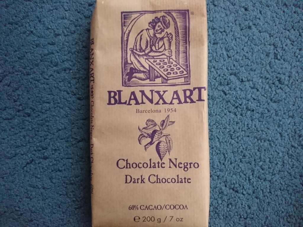 Otworzyłem tą butelkę do tabliczki hiszpańskiej czekolady Blanxart Chocolate Negro 60%. Czysty skład (w tym 60% kakao, cukier, masło kakaowe, wanilia ), bez żadnych ulepszaczy. Bardzo ładne papierowe opakowanie. Produkty Blanxart są wytwarzane z ekologicznie uprawianych ziaren kakaowca, które pochodzą z pięciu różnych regionów świata: Peru, Filipiny, Ekwador, Kongo i Brazylia. Czekolada, którą degustowałem nie jest wyraźnie gorzka, idzie raczej w stronę słodyczy, ale jest całkiem przyjemnie zrównoważona, kremowa. Z Banyuls Rimage wypadła naprawdę fajnie.