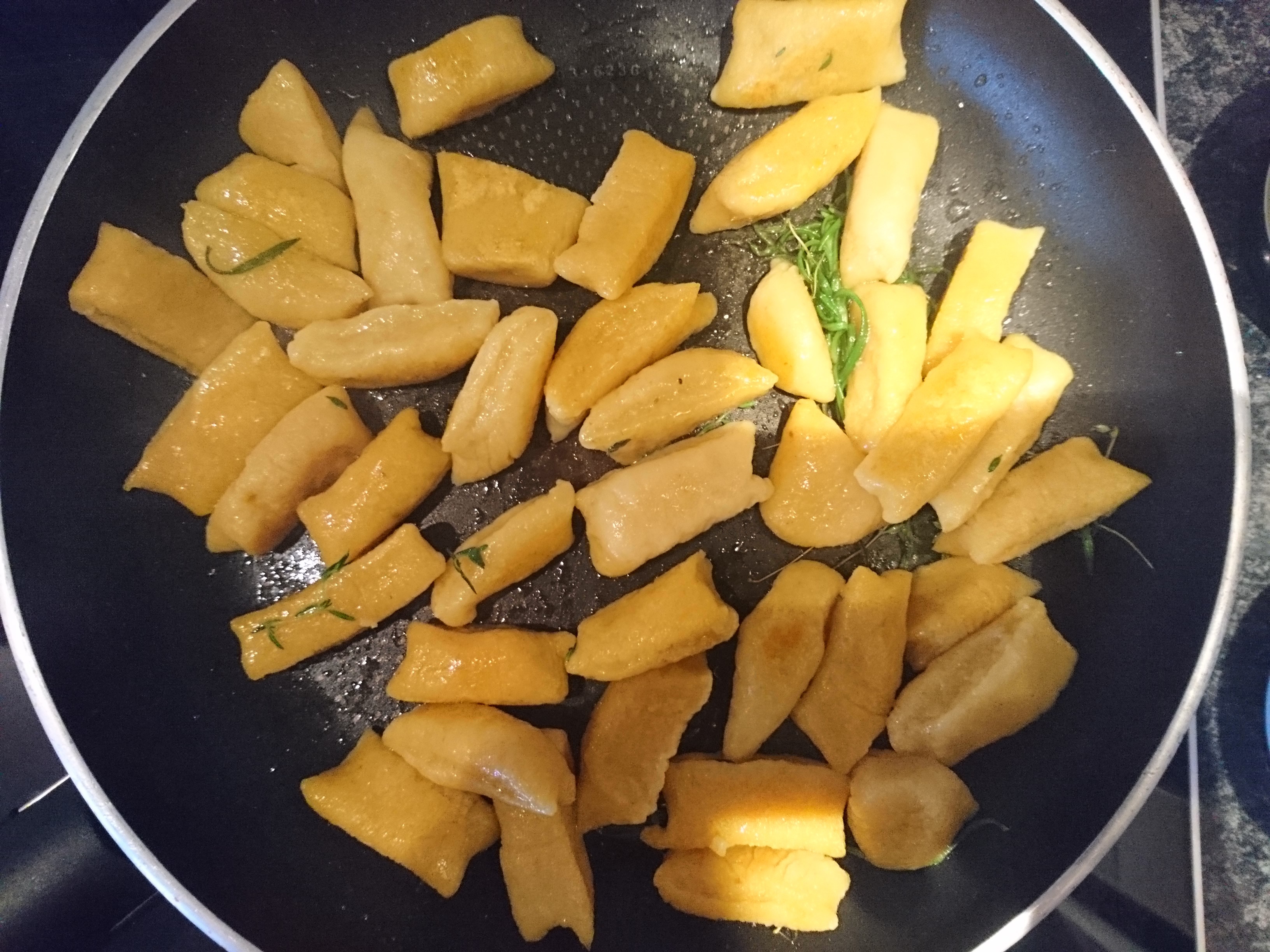 Przygotowanie: Ziemniaki ugotować i ostudzić. Upieczoną dynię, ziemniaki, jajka, łyżkę soli, mąkę umieszczamy w pojemniku robota kuchennego i miksujemy do połączenia składników. W razie potrzeby można jeszcze wyrobić ciasto na stolnicy dodając nieco więcej mąki. Na patelnię wlewamy wino i gotujemy, aż nieco się zredukuje. Dodajemy śmietanę i chałwę i dokładnie mieszamy. Dorzucamy kozi ser, doprawiamy solą i pieprzem oraz posiekaną natką pietruszki. Sos trzymamy w cieple. Z ciasta formujemy podłużne wałeczki i kroimy je na kształt gnocchi. Kluseczki gotujemy w osolonym wrzątku przez 4 minuty. Na osobnej patelni roztapiamy masło z dodatkiem tymianku. Wrzucamy ugotowane i odsączone gnocchi i przesmażamy krótko. Nakładamy gnocchi na talerze, polewamy sosem serowo-chałwowym i posypujemy tartym parmezanem.