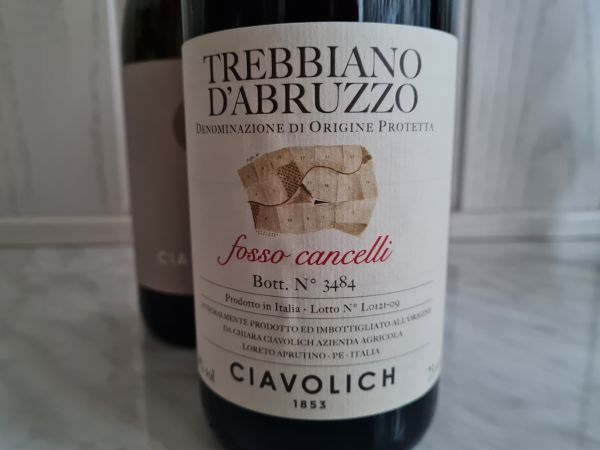 Ciavolich Fosso Cancelli Trebbiano d’Abruzzo DOP 2021, a więc trebbiano z najstarszych winnic w Loreto Aprutino na wysokości 250 m n.p.m. Ręczny zbiór, spontaniczna fermentacja w dużych beczkach z dębu slawońskiego i terakotowych amforach, w których wino następnie leżakuje na osadzie