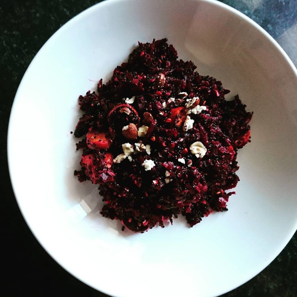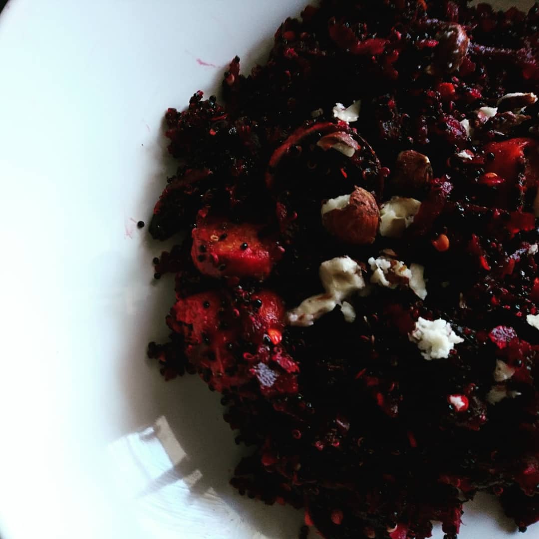 Komosa, burak i chorizo to strzał w dziesiątkę. W szczególności czarna komosa, która ma nieco inny smak niż ta biała i stanowi podstawę tego dania, bardzo dobrze komponuje się z pozostałymi składnikami.