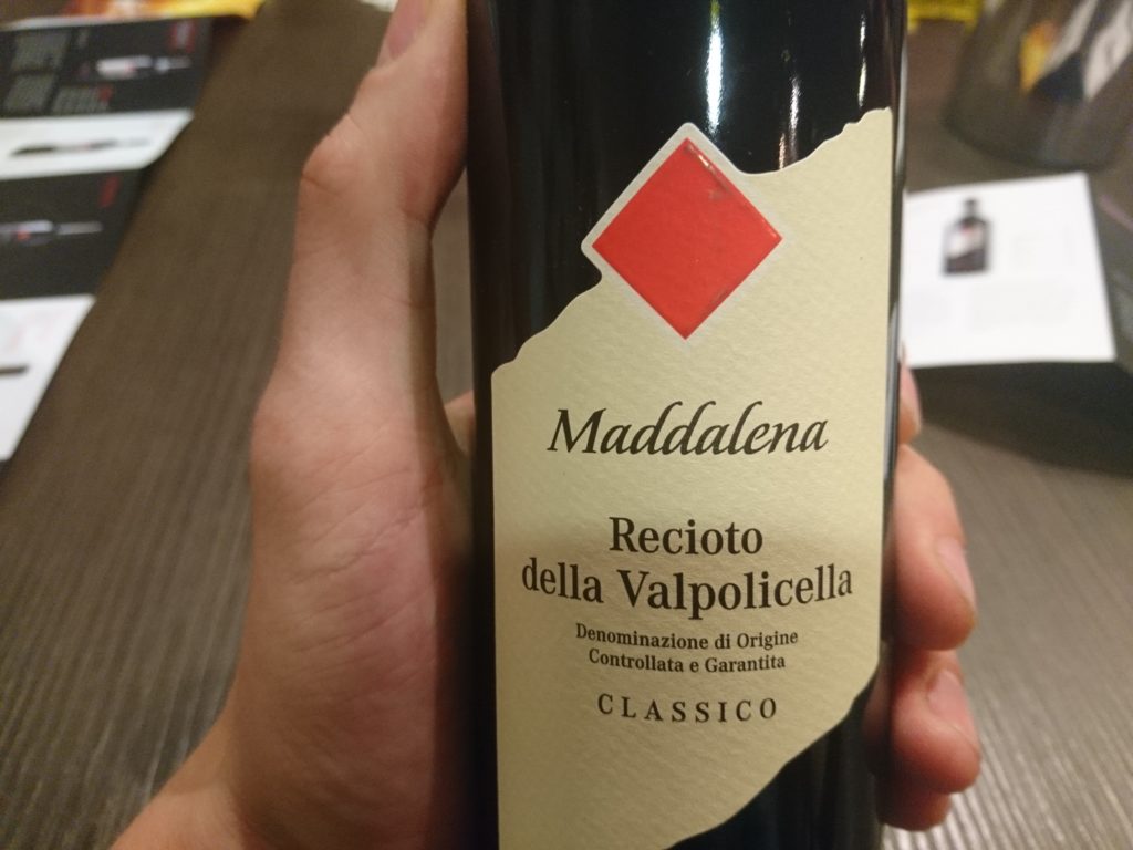Na koniec degustacji do kieliszka trafiło Recioto. Kupaż Corvina 60%, Corvinone 20%, Rondinella 10%, Molinara 10%. Grona podsuszane przez 100-130 dni. Dojrzewa w małych dębowych beczkach przez 12 miesięcy i kolejne 12 w butelce. Niezwykle przyjemne Recioto, może nie wielce wyrafinowane, ale reprezentujące dobry poziom. Akcenty syropu owocowego, suszonych wiśni, czerwonych owoców, orzechów z pewną dawką słodko-korzennych przypraw. W ustach wyważone i subtelnie słodkie. Więcej o tym winie przy okazji jego degustacji, gdyż owe Recioto również przywiozłem ze sobą.