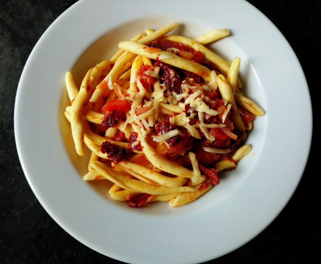 Przygotowanie: Makaron gotujemy al dente i odcedzamy. Na patelni rozgrzewamy nieco oliwy, dodajemy 3 łyżki nduji, cebulę i smażymy na średnim ogniu około 3 minut. Dodajemy pokrojone pomidory, wlewamy wino i gotujemy, aż wino zredukuje swoją objętość o połowę. Sos doprawiamy do smaku, dorzucamy oregano, a także odcedzony makaron. Dorzucamy połowę startego sera, mieszamy dokładnie całość i trzymamy chwilę na ogniu. Gotowe danie nakładamy na talerze, dodajemy na każdą porcję jeszcze odrobinę nduji i posypujemy resztą sera.