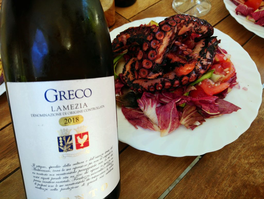 Ośmiornicę podałem z białym, lokalnym Greco Lamezia DOC 2018 od Lento. Świetne kontekście relacji jakości do ceny, świeże, owocowe, spełniło swoje zadanie, a więcej o nim innym razem. Do tak przyrządzonej ośmiornicy sprawdzą się też inne białe, śródziemnomorskie wina ( Vermentino, Fiano, Assyrtiko, inne białe greckie, niebeczkowe Chardonnay, biel z Sycylii ). Sięgnijcie również po Albarino lub dobre rose. A może Cava?
