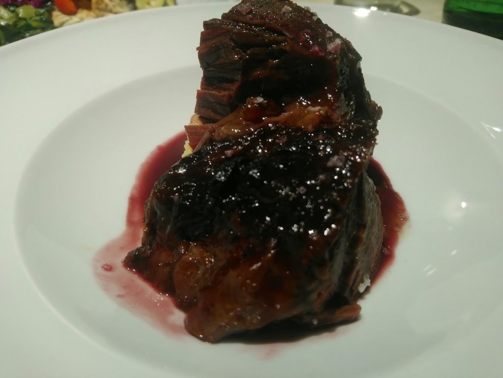 Zdecydowałem się na duszoną wołowinę w sangiovese z polentą oraz pieczone warzywa. Mięso idealnie ugotowane – po prostu rozpływało się w ustach, a do tego bajeczny sos na bazie sangiovese.