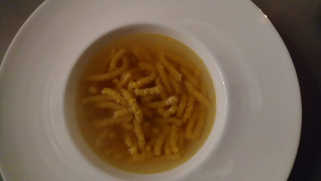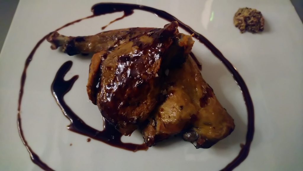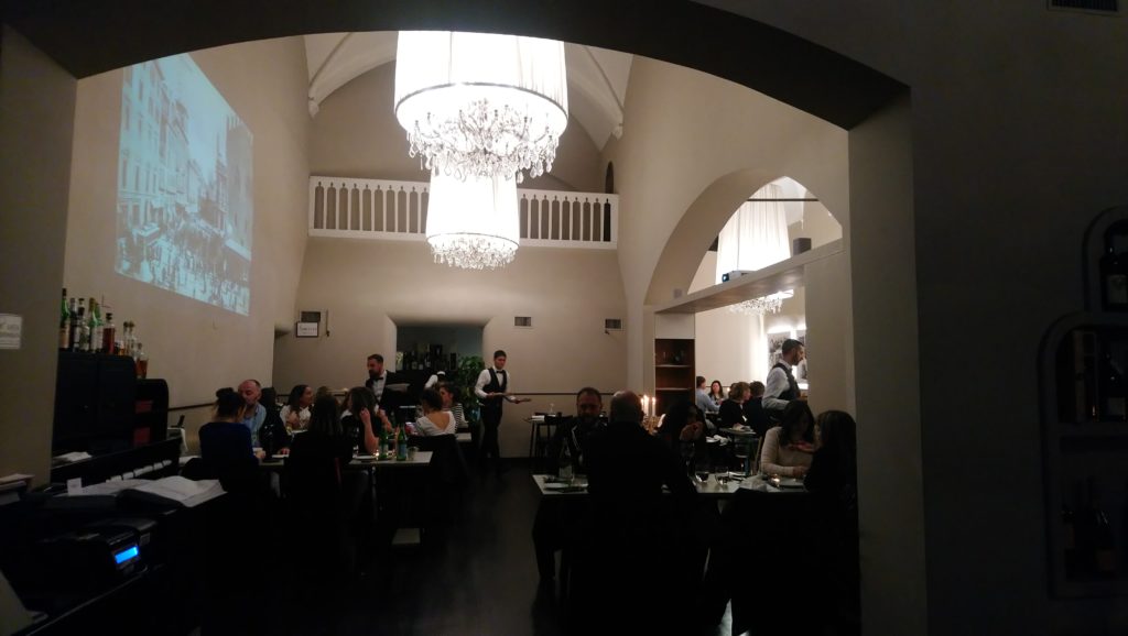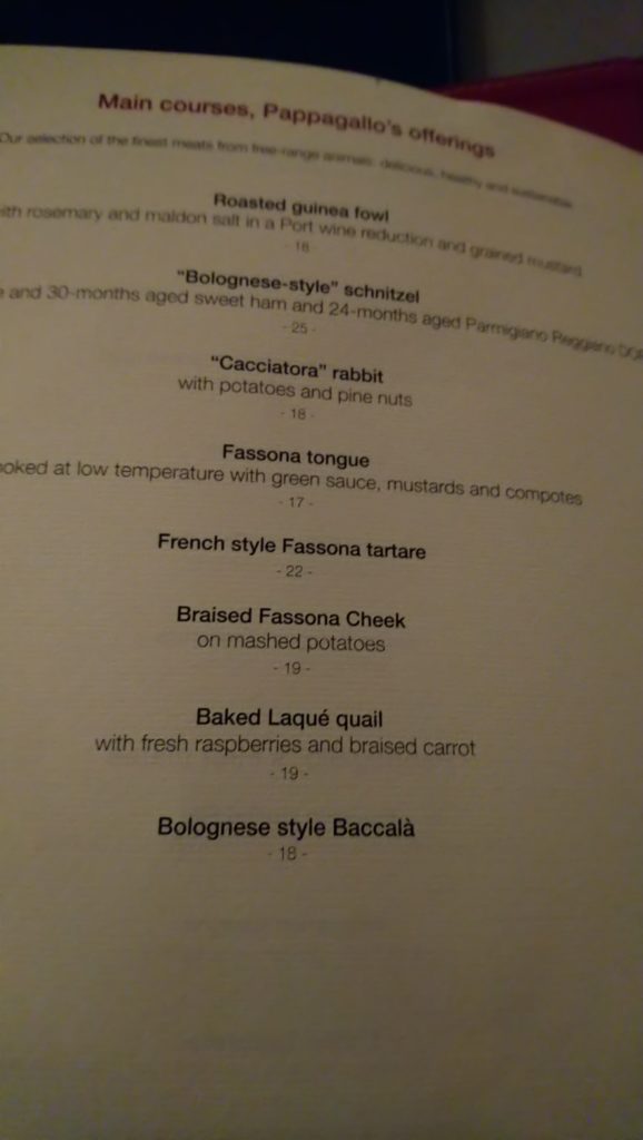 Przynajmniej kilka pozycji z karty brzmi niezwykle zachęcająco, ale jak to w Bolonii bywa, w tym mieście w zasadzie człowiek je przez cały czas, więc wszystkiego skosztować się nie da. Tym razem zdecydowałem się na jedną z lokalnej klasyki – passatelli w bulionie ( rodzaj makronu/kluseczek formowanych z bułki tartej, jajek, parmezanu ) pływających w pysznym i esencjonalnym wywarze ( tym samym, w którym podaje się tradycyjne tortellini ). Drugie danie, które wybrałem to pieczona w rozmarynie i soli maldon perliczka z redukcją porto i ziarnistą musztardą. Perfekcyjnie upieczone mięso z pysznym sosem dobrze komponowało się z kieliszkiem Tauleto – doskonałego wina od zasłużonego dla regionu producenta Umberto Cesari. Więcej o samym winie innym razem, gdyż jego butelkę przywiozłem ze sobą do kraju. Na marginesie: pan sommelier chciał mi zaproponować kieliszek Brunello di Montalcino do zamówionej perliczki, ale ja wolałem pozostać jednak w lokalnych klimatach i swojego wyboru nie żałuję. Tauleto to wspaniale wino, o czym z pewnoscią napiszę, gdy tylko je otworzę.