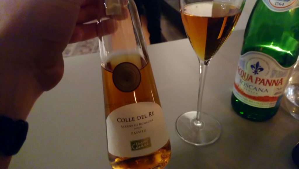 Deser też musiał się znaleźć, a było nim kolejne wino od Umberto Cesari – Colle del Re Albana di Romagna Passito. Piękne, słodkie deserowe wino, które idealnie zwieńczyło kolację. Więcej o nim przeczytasz tutaj, gdyż ta butelka również przyleciała ze mną do Polski. Sącząc sobie spokojnie Colle del Re, w pewnej chwili kelner przyniósł mi mały prezent od szefa kuchni, coś ekstra, czego nie zamawiałem. Taki mały deserek: czekolada/ser/orzech. Całkiem smaczne, ale wina i tak nie przebiło.