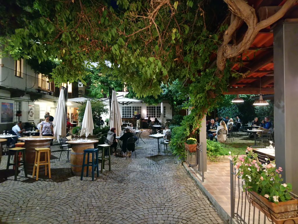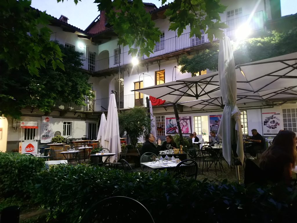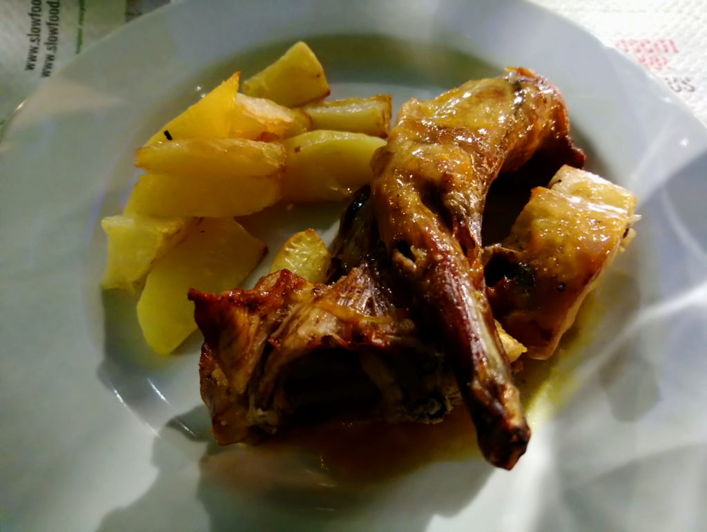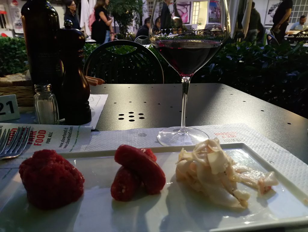 Podczas moich dwóch wizyt w Osterii zamówiłem przystawkę pod postacią lardo, salsicci di Bra oraz tatara cielęcego, tajarin z sosem z salsicci di Bra oraz królika carmagnola w białym winie Roero Arneis. Do tego kieliszek Barolo Serralunga d’Alba od Massolino oraz piemoncki digestif – Barolo Chinato ( Barolo aromatyzowane różnymi ziołami i przyprawami ), które zastąpiło mi deser 🙂.