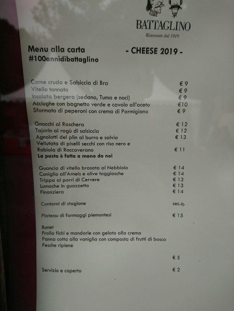 Będąc w Bra, czy to podczas samego Cheese, czy przy innej okazji, warto postarać się o rezerwację stolika w Battaglino i zjeść kolację w miejscu, które już od dawna na dobre zakorzeniło się w tym małym, piemonckim miasteczku. Restauracja istnieje od 1919 roku i to prawdziwie rodzinne przedsięwzięcie, które prowadzi już kolejne pokolenie. I tą rodzinną atmosferę można wyczuć na każdym kroku. Byłem tu po raz pierwszy, ale miałem wrażenie, jakbym zaglądał tutaj już od jakiegoś czasu. Goście przychodzą do Battaglino całymi rodzinami i widać, że większość dobrze zna się z właścicielami. W sumie nie ma się czemu dziwić. Autentyczna, lokalna, nieprzekombinowana kuchnia broni się sama, a dowodem tego jest pełne obłożenie lokalu każdego wieczoru oraz liczne wyróżnienia i rekomendacja tego miejsca przez sam Slow Food.
