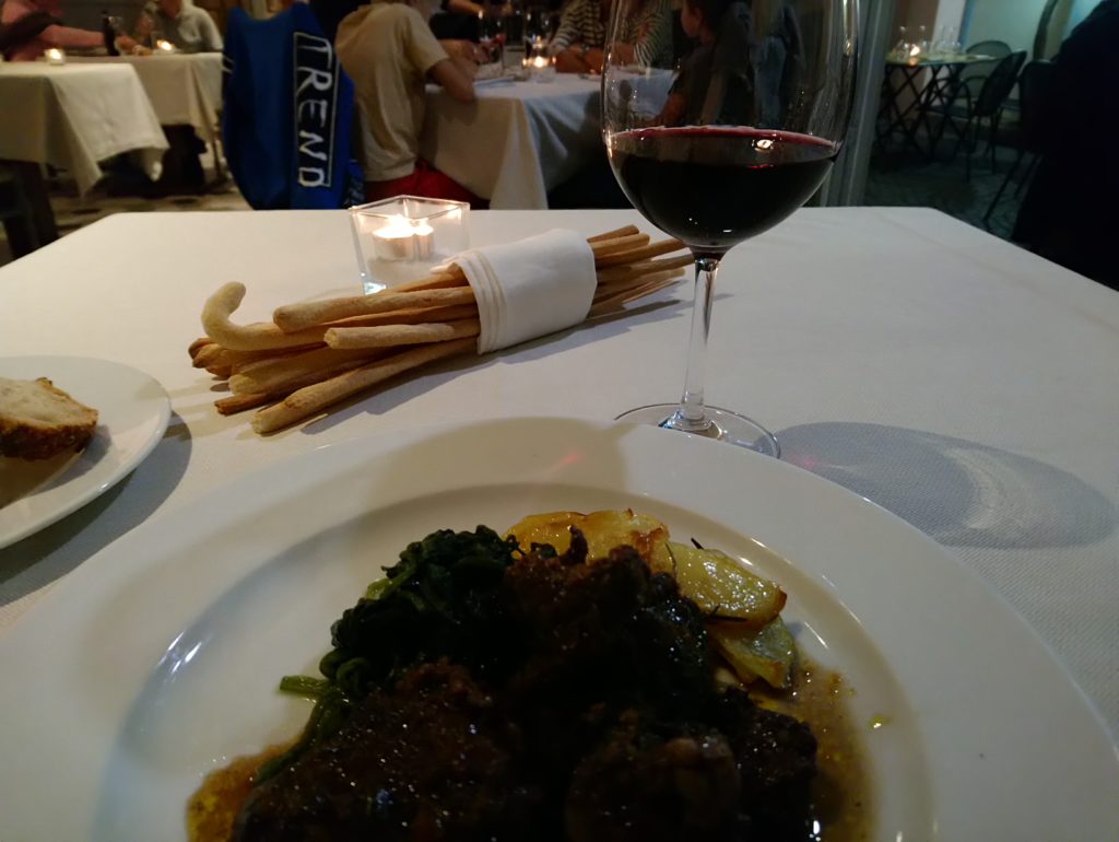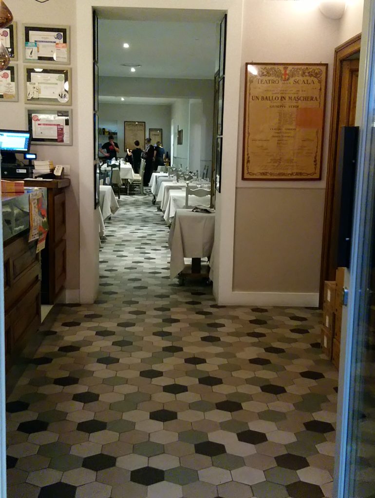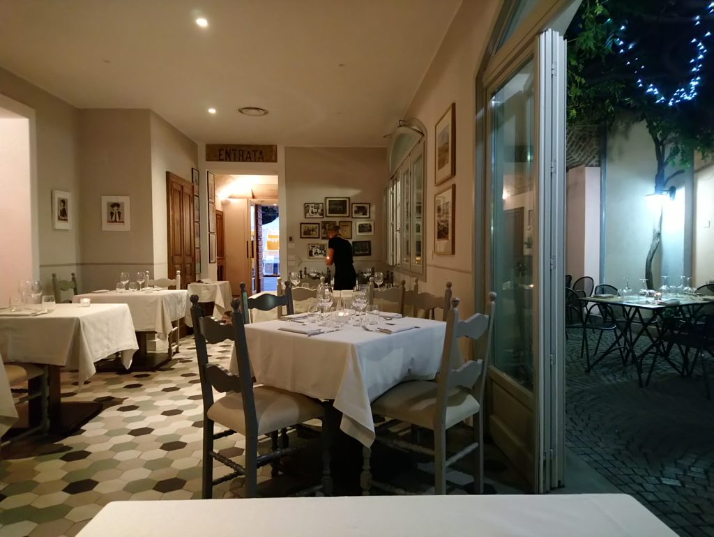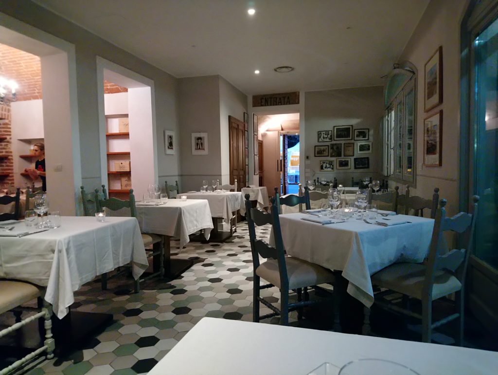 W restauracji zjawiłem się o godzinie 19:30 – zgodnie z wcześniejszą rezerwacją, a w przeciągu kolejnych 30 minut lokal wypełnił się gośćmi do ostatniego stolika. Świadczy to o niemałej popularności tego miejsca w Bra, a dodatkowo w czasie festiwalu Cheese zjedzenie tutaj kolacji tym bardziej do łatwych rzeczy nie należy. Tak więc, rezerwacja obowiązkowa dla wszystkich chętnych.