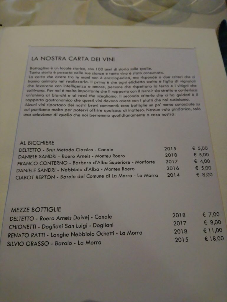 Karta w Battaglino, podobnie zresztą jak w Osterii del Boccondivino nie jest nadmiernie rozbudowana i bazuje na piemonckich, lokalnych klasykach podawanych w prosty sposób. Liczy się autentyczny smak jakościowych produktów, bo on przecież obroni się sam. Pod tym względem Battaglino ma wiele wspólnego ze wspomnianą Osterią.