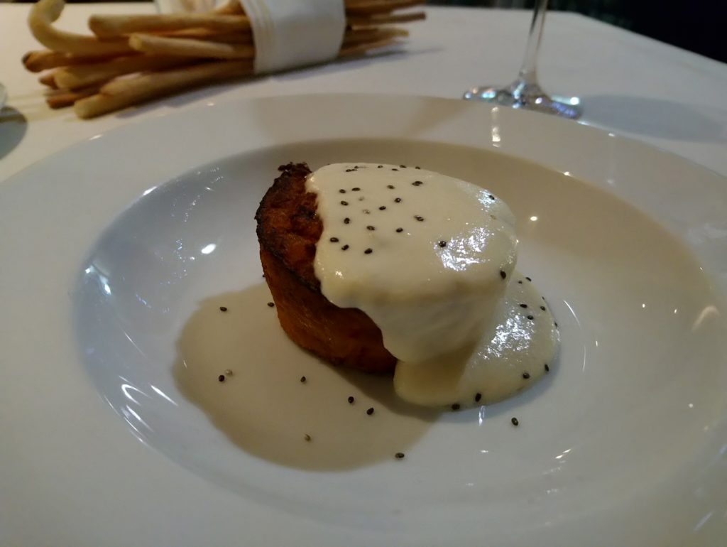 Podczas kolacji w Battaglino zamówiłem trzy dania: flan paprykowy z sosem z parmigiano, policzek cielęcy duszony w nebbiolo oraz klasyczny piemoncki deser, czyli bonet.