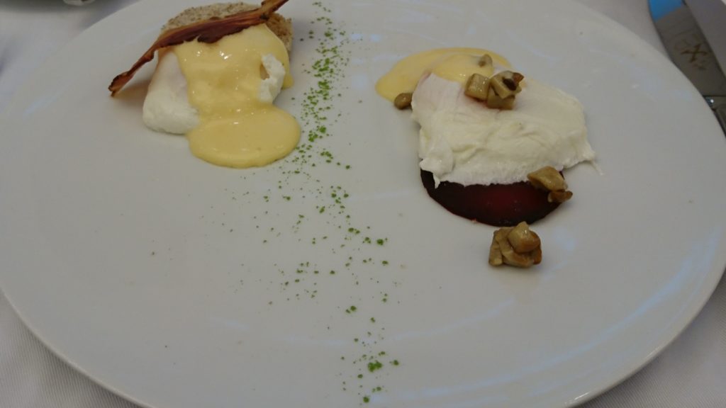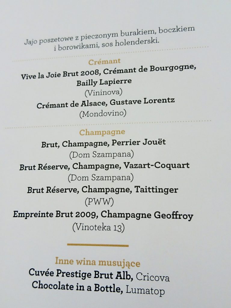 Następnego dnia, w niedzielę, udałem się jeszcze na organizowane przez Magazyn Wino Bubble Breakfast, czyli szampańskie śniadanie, które również odbyło się w Hotelu InterContinental. Podczas tego śniadania serwowane były szampany i inne wina musujące, którym towarzyszyły przekąski i menu przygotowane przez Karola Okrasę. Na stole pojawiły się m. in. takie dania i przekąski jak sałatka z pieczonych warzyw z wędzonym białym serem, marynowany łosoś na musie z pieczonego bakłażana, carpaccio z wędzonej piersi gęsi z pieczonymi burakami i sosem truflowym, pasztet z królika z konfiturą cebulową i pistacjami, tatar z tuńczyka z musem z kalafiora i sałatką z cykorii wraz z omletem szpinakowym z kozim serem, jajo poszetowe z pieczonym burakiem, boczkiem i borowikami z dodatkiem sosu holenderskiego.