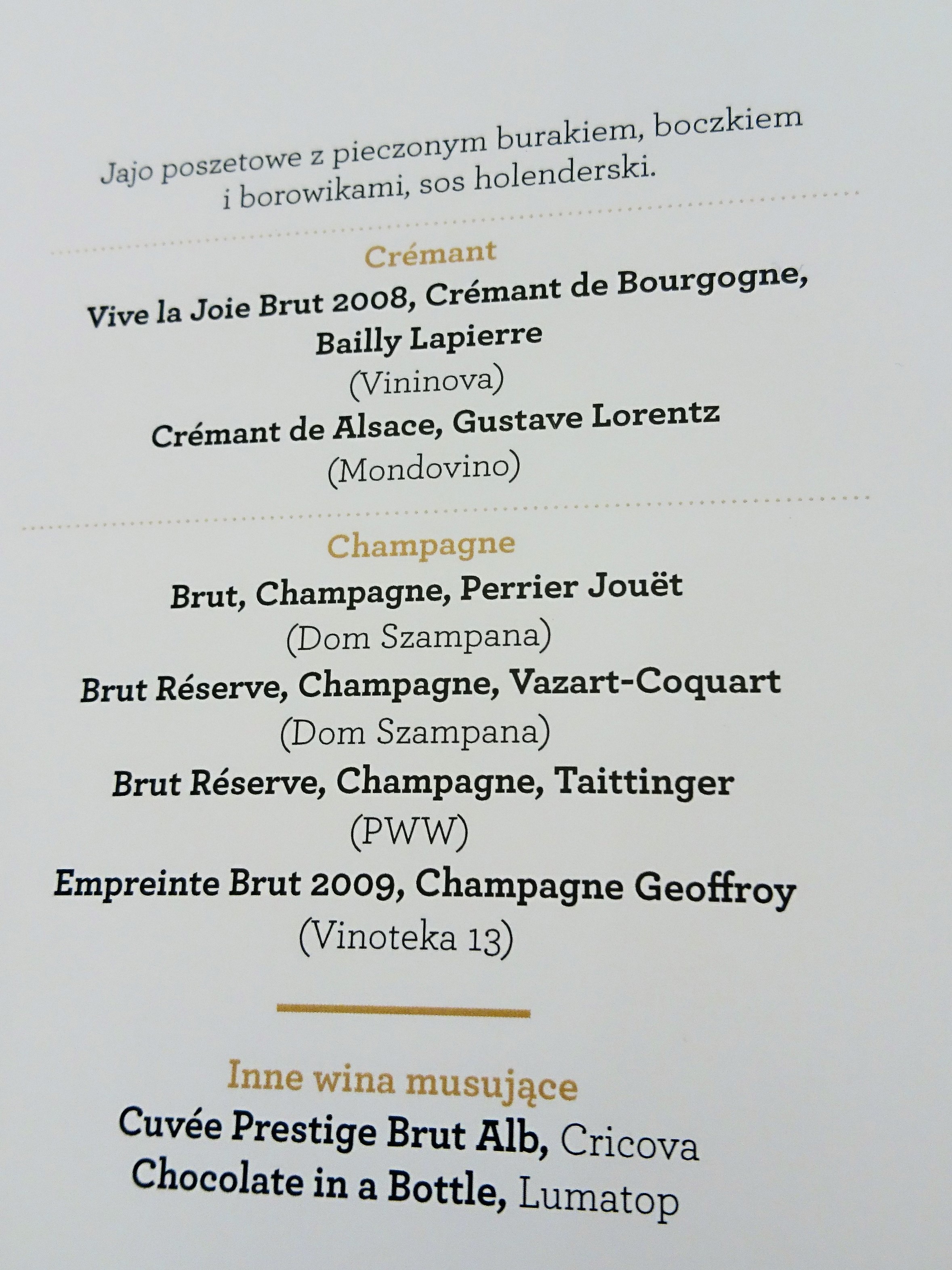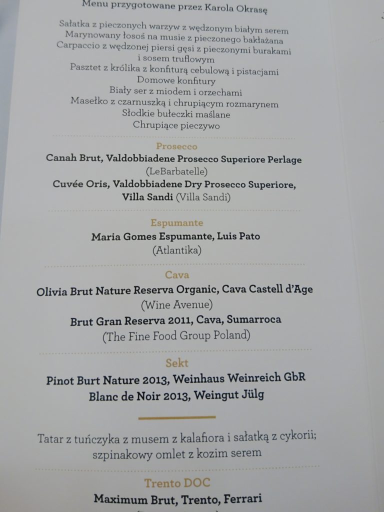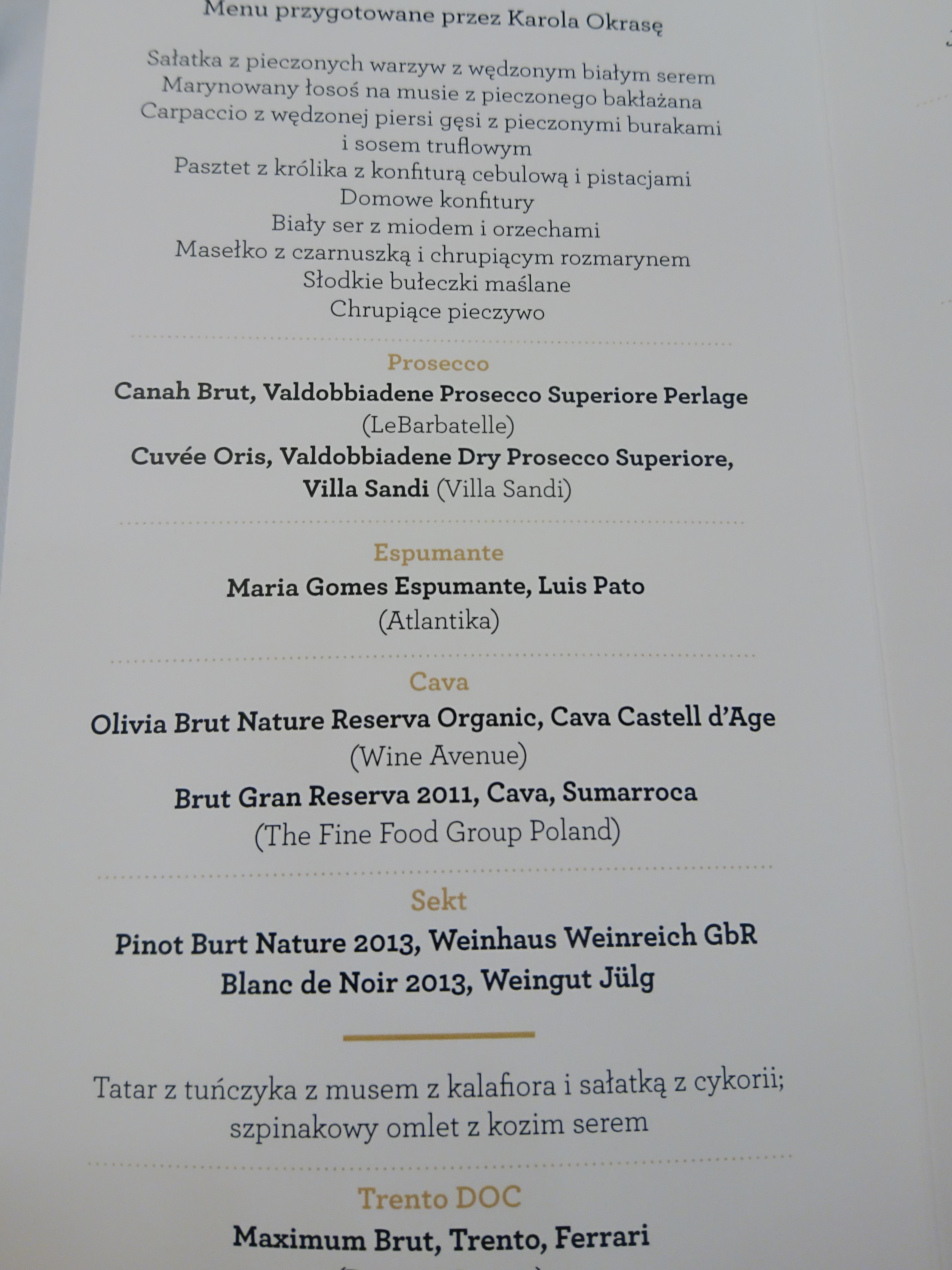 Do tego serwowane były gościom wyselekcjonowane wina musujące. Pojawiły się Szampany, Cavy, Franciacorty, Prosecco, Cremanty, Espumante, Sekty. Poniżej lista niektórych win musujących, jakich goście mieli okazję skosztować.
