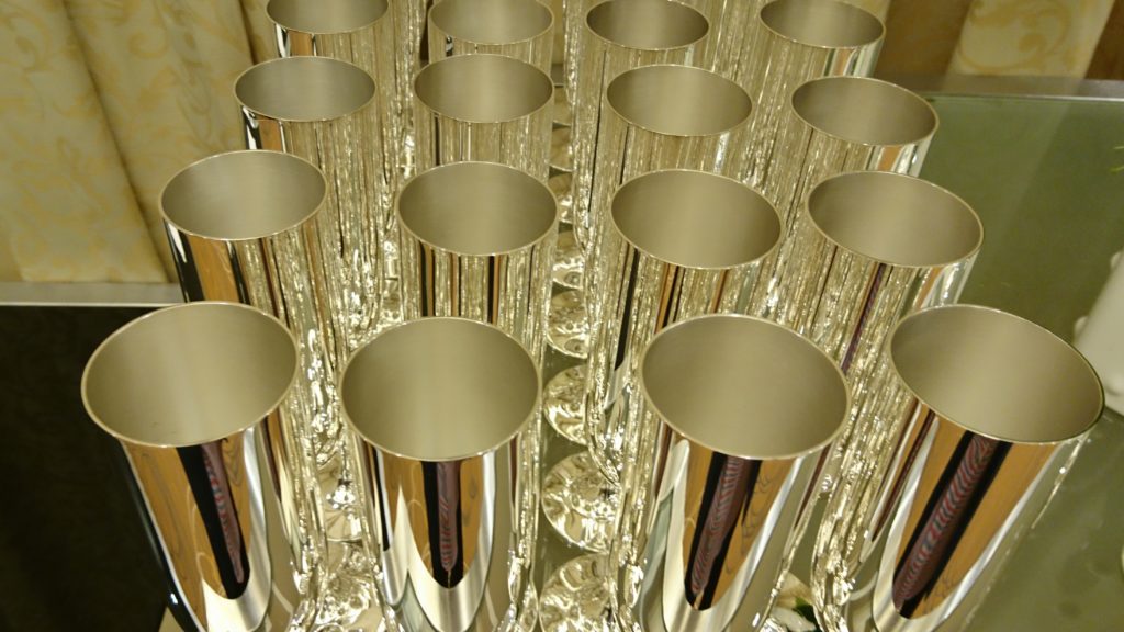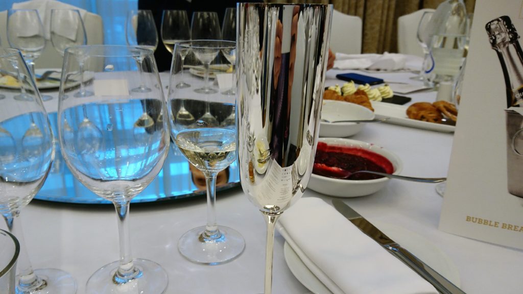 Najbardziej przypadła mi do gustu Franciacorta Alma Gran Cuvee Brut od Bellavista, bardzo znanej i cenionej posiadłości. Ogólnie, Franciacorta to jedno z moich ulubionych win musujących, które niezwykle sobie cenię. Ponadto świetna była też Cava Brut Gran Reserva 2011 Sumarroca. Szczególną moją uwagę zwrócił też Cremant de Alsace Gustave Lorentz oraz Brut Reserve Champagne Taittinger. Ponadto ciekawostką było Chocolate in a Bottle Lumatop, wino musujące o smaku czekolady zrobione z Chardonnay i naturalnych ekstraktów kakao i orzechów laskowych. Ciekawy i nietuzinkowy smak. Co więcej, podczas Bubble Breakfast była okazja do spróbowania szampanów w niezwykłych kieliszkach wykonanych ze srebra w limitowanej edycji, które jak można się domyślić do tanich nie należą. Są dość masywne i ciężkie jak na kieliszek, ponoć ich kształt i materiał , z którego zostały zrobione mają uwydatniać zalety szampanów, choć ja osobiście nie wyczułem wielkiej różnicy degustując wina w tym właśnie kieliszku. Jednakże z ciekawością spróbowałem, gdyż niecodziennie jest okazja napić się szampana z tak drogiego kieliszka.